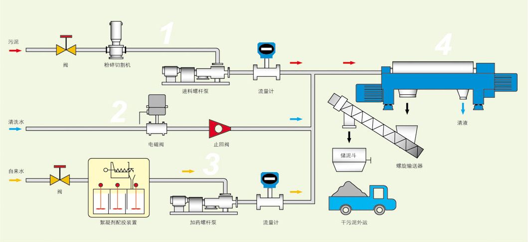 壓縮階段:螺旋推進器將沉降固體推送至卸料端,污泥在離心力的作用下得到進一步壓縮,并釋放出孔隙水。